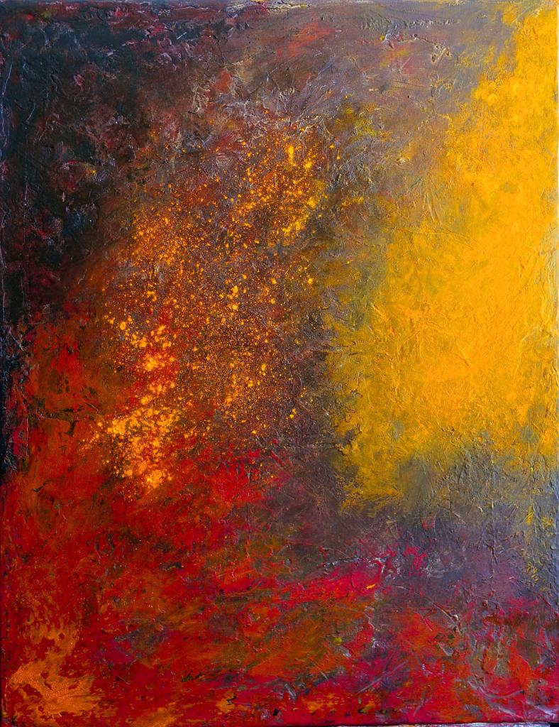 ABSTRAITS : J’ai voulu expérimenter, m’exprimer plus librement, jouer avec la matière et des teintes chaudes et cuivrées... Une particularité de cette série : peindre sans pinceaux, juste mes mains, des tissus, du spray, des couteaux, et de l’imagination !